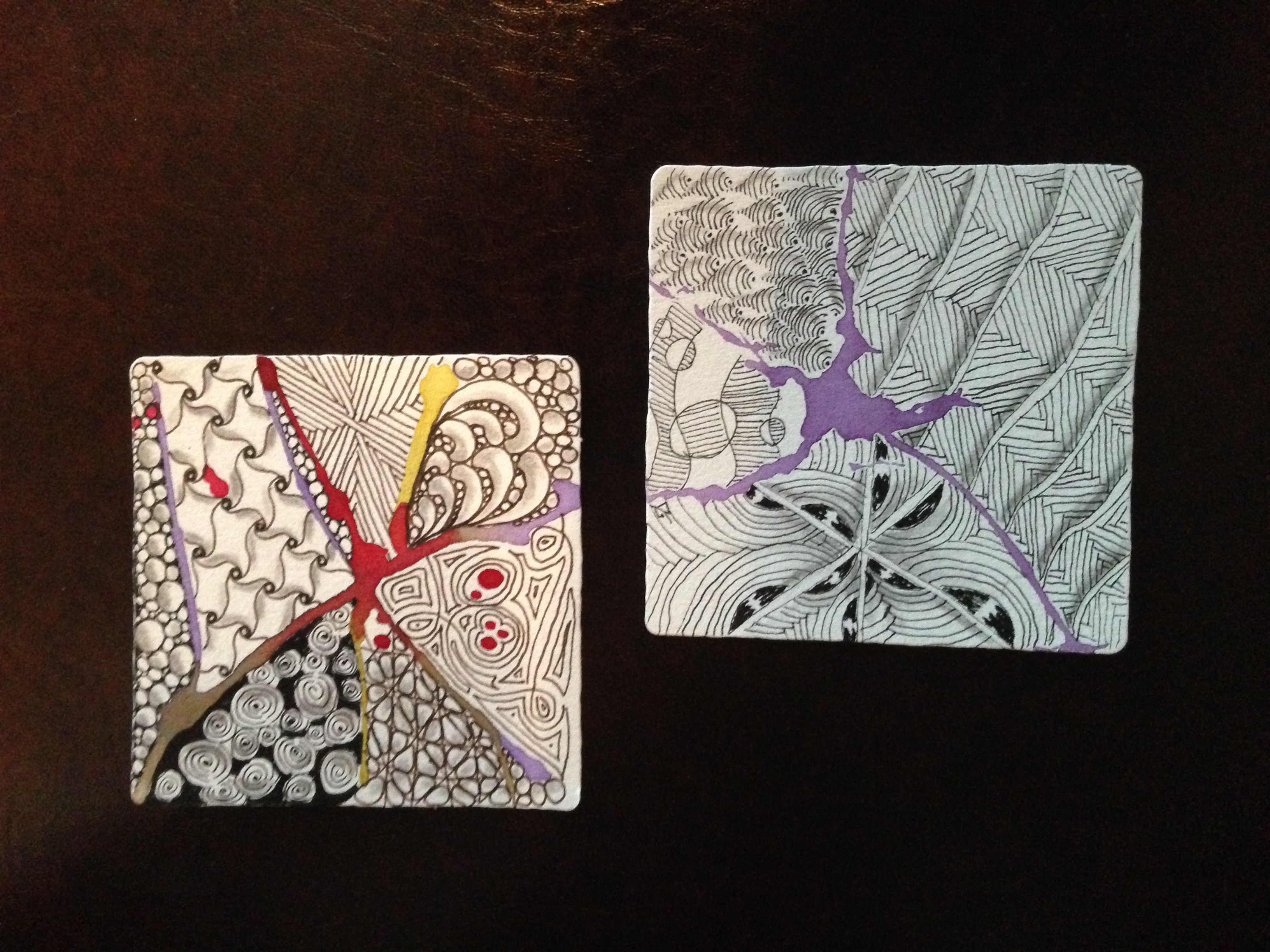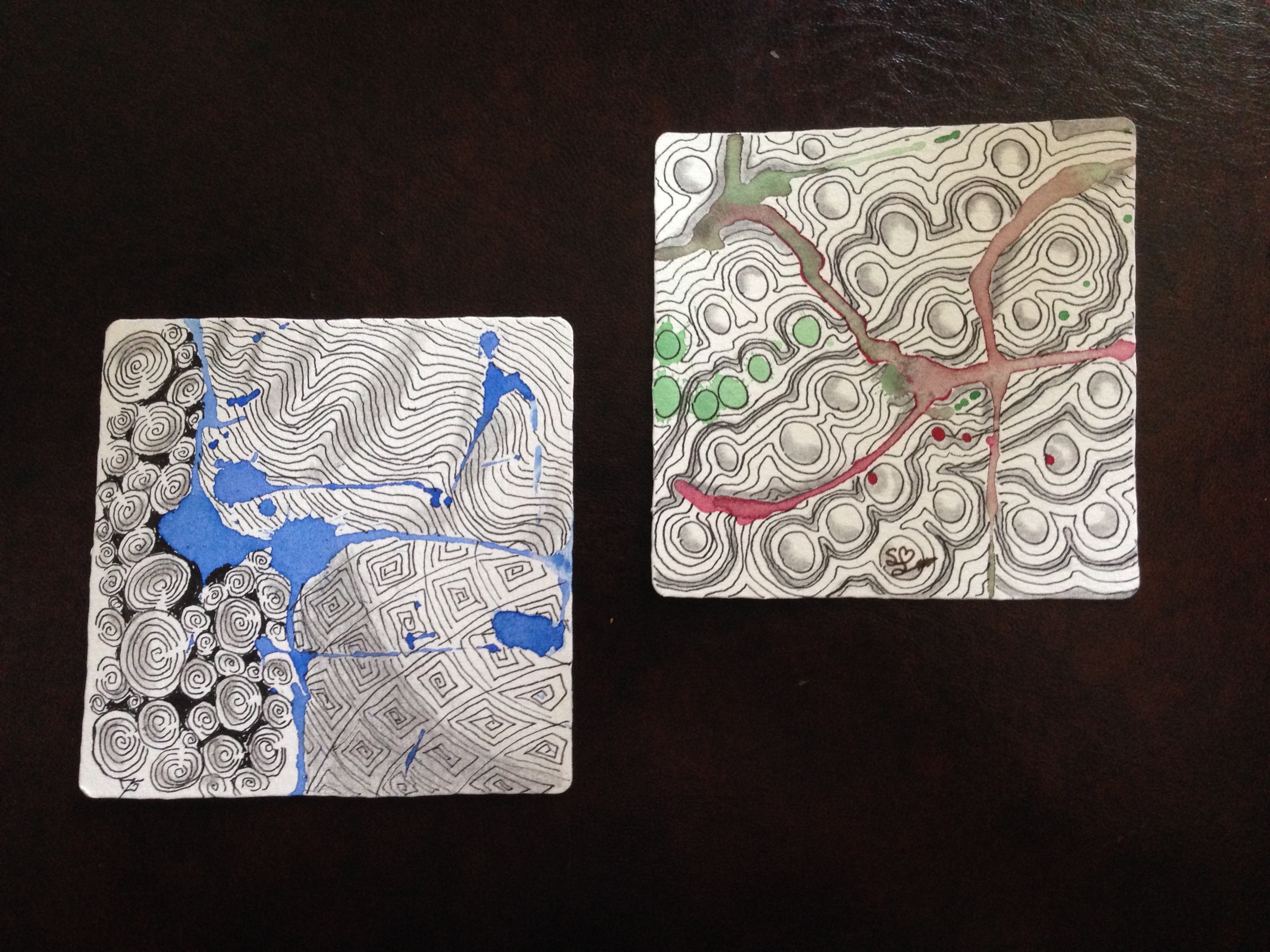 Then we tangled between the lines. Left tile tangles: Printemps, Static, & Emingle. Right tile: mono tangle; Nipa.