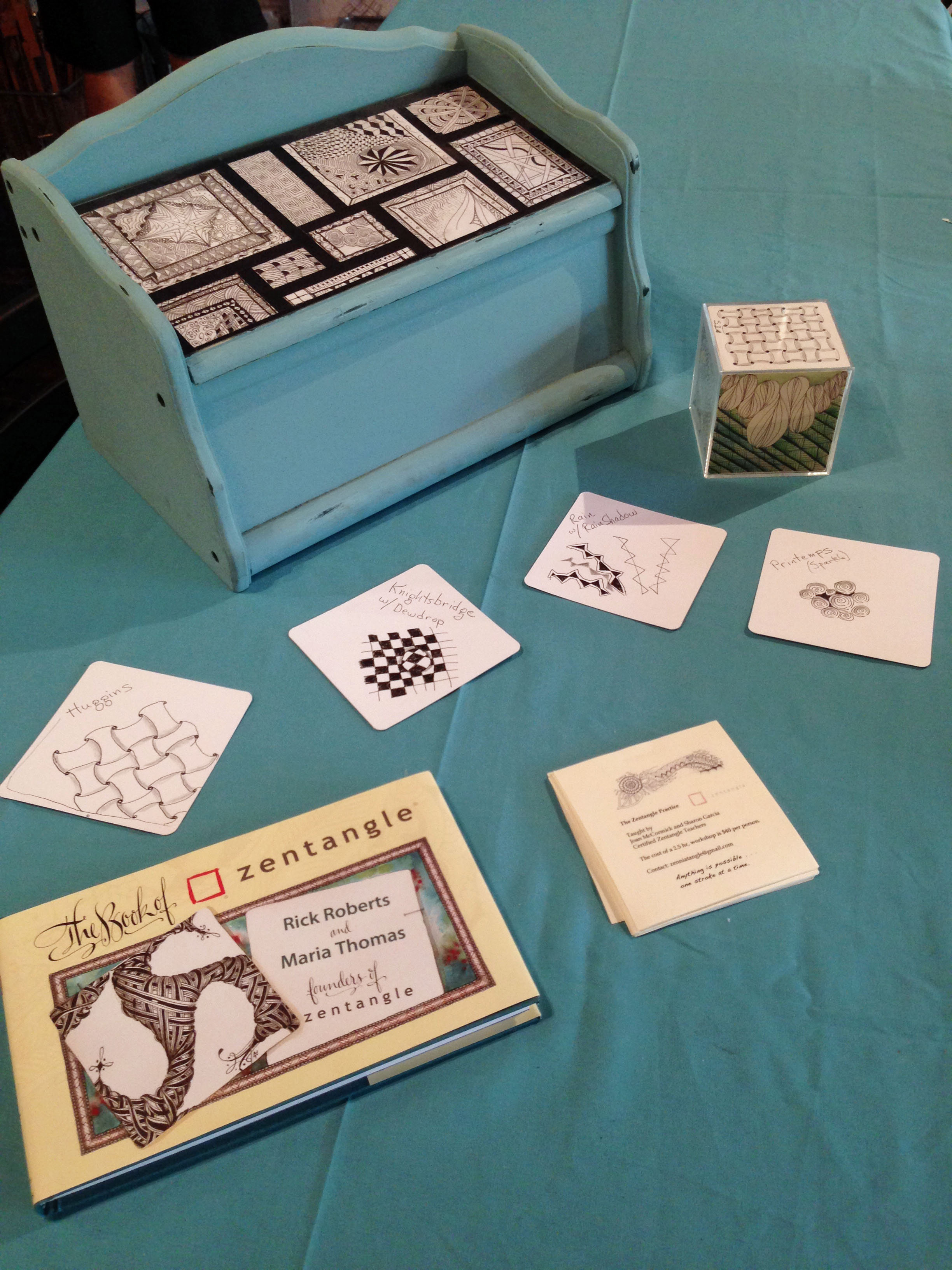 This was an exciting day at the new gallery, Brushstrokes Art Studio & Gallery, where I will be teaching Zentangle classes in Oroville. It was grand opening day so I thought it would be fun to start a project for the gallery. I brought along a display to intrigue potential students and a plan to do short demos where people could complete small string sections on a set of 9 tiles that would eventually fit together to make one big tile. There was a lot going on and although I generated a lot of interest in Zentangle only a few took the time to sit down to tangle with me. I had much difficulty focusing too with all the excitement going on around me. I will amend my plan to having my future students complete little sections during my classes and future demos there. One day in the future it will e a lovely collaborative work of art donated to the gallery.