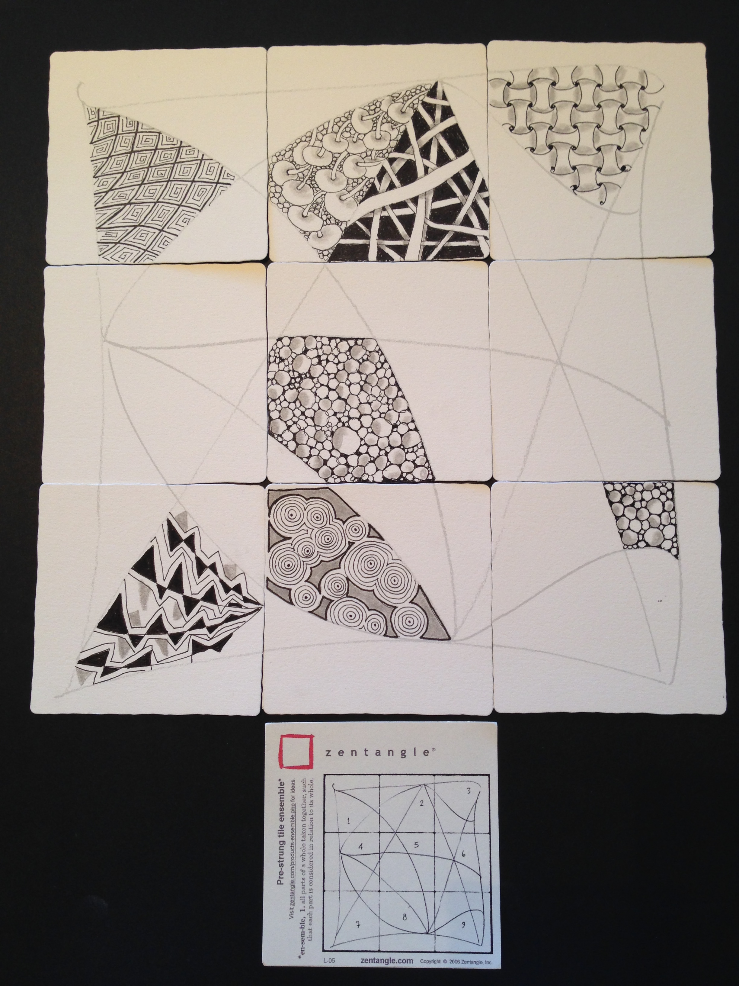 9 tiles makes 1: This tile kit is no longer available but it’s easy to create your own with 9 blank tiles. Lay them out as shown and draw the string as though it were 1 big tile. Then have each of your tangling tangle a tile or keep passing all 9 tiles around until all the spaces are complete. Put the puzzle back together and frame it.